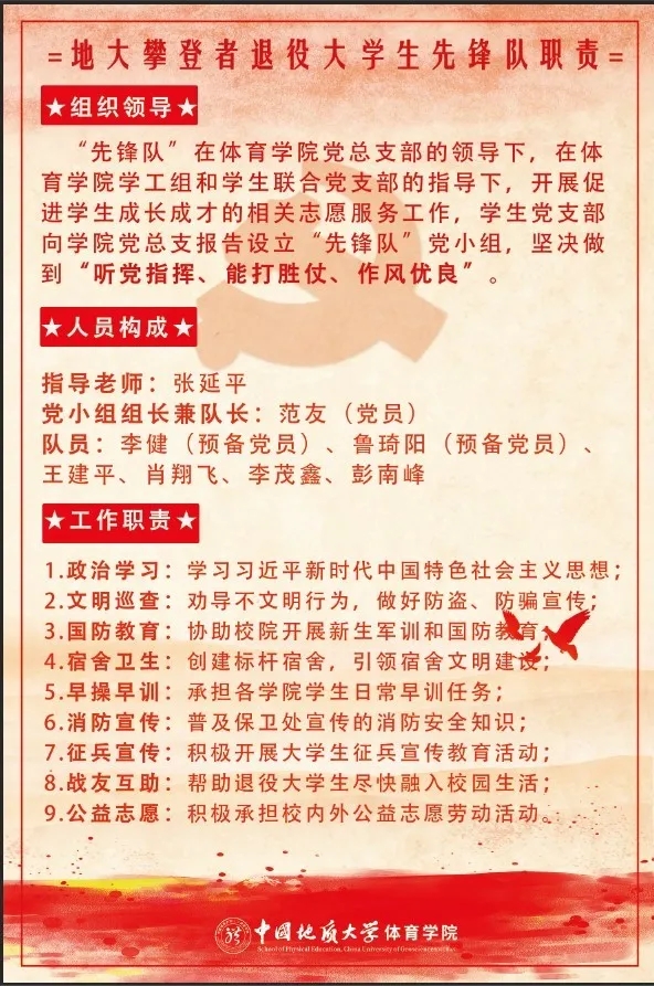 虽然这几名退役军人已经离开部队,但军人“退役不退色”,在世界杯体育官方网站党总支的领导下,在学院学工组和学生联合党支部的指导下,开展促进学生成长成才的志愿服务工作。地大攀登者退役大学生先锋队的队员们要在理论武装、行为养成、学风建设、校园文明和国防教育等方面发挥标杆作用。