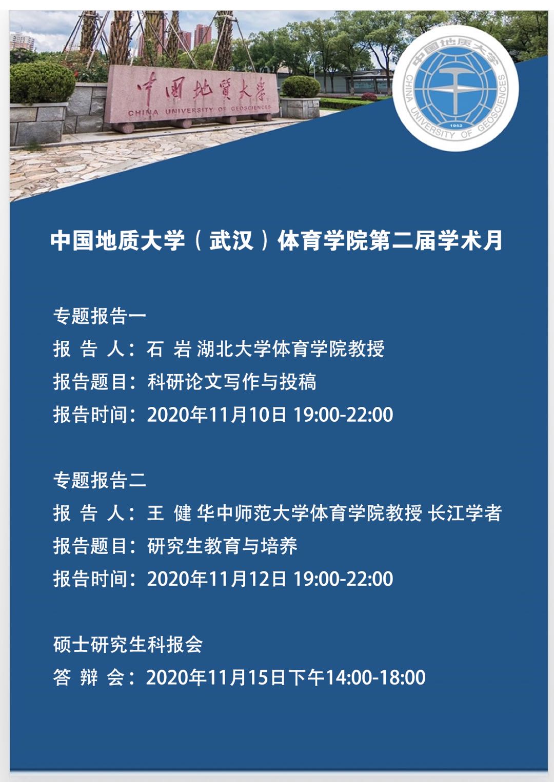 11月15日14时,世界杯体育官方网站2020年研究生科报会在体育馆三楼报告厅顺利举行。本次科报会由世界杯体育官方网站副院长杨汉教授主持,共邀请12名教师担任评委,全体研究生参加了本次科报会。