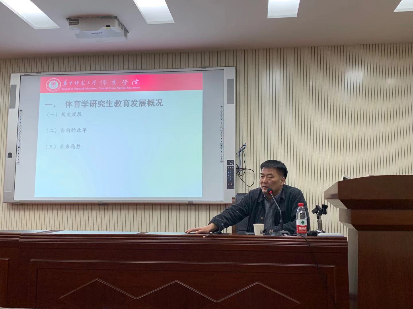 11月12日19点,第二场专题报告由华中师范大学世界杯体育官方网站教授、博士生导师、长江学者王健讲授《研究生教育与培养》。首先由世界杯体育官方网站副院长杨汉教授介绍基本情况,王健教授是长江学者,博士生导师,国家体育总局体育文化研究基地负责人,教育部高等学校体育教学指导委员会委员,中国高等教育学会体育专业委员会理事,中国社会学会体育社会学专业委员会理事,主要研究方向是学校体育学、体育产业、体育社会学、运动训练等。