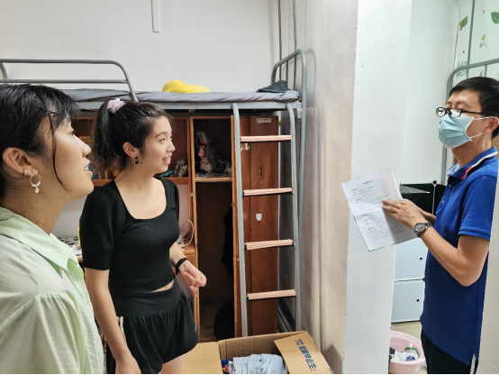在走访研究生宿舍过程中,刘良辉副院长深入每间宿舍,认真查看宿舍内的各项设施,耐心细致地和同学们交流,详细地了解每位新生的名字、家乡籍贯、本科专业等信息,并给予生活、学业等方面的建议。张毅恒副教授对研究生新生提出了殷切的希望,希望同学们积极肩负起自己的责任,牢记“艰苦朴素,求真务实“的校训,吃苦在前,享乐在后,登高望远,勇攀学术高峰。辅导员陈老师嘱咐同学们要认真做好防疫工作,注意个人防护,加强安全防范意识,谨防上当受骗。