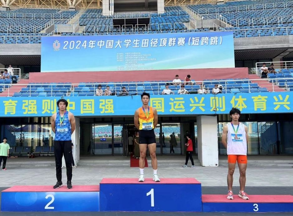 在5月25日下午举行的男子丙组110米栏的决赛中,世界杯田径队2023级新生陈天尧,在前程稍显落后的情况下拼尽全力,在最后一个栏实现逆转,连续超越5人突出重围,以14.30秒的成绩收获一枚铜牌。陈天尧同学在比赛中展现出了地大学子“不畏艰难,迎难而上,勇于攀登”的拼搏精神,值得学习和肯定。同时生动诠释了竞技体育的魅力,不到终点永不放弃!