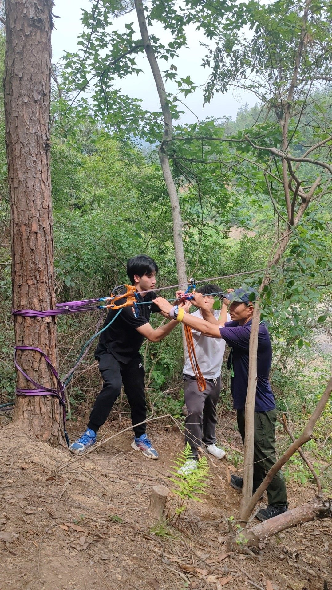 下午,秦长胜老师组织教师们体验了惊险刺激的溜索项目。秦老师带领团队自己搭建站点,进行安全测试,随后组织教师们有序开展体验活动。教师们在实践中熟悉了溜索运动的流程与安全要点,顺利完成高空滑行,也为日后的教学积累了丰富经验。
