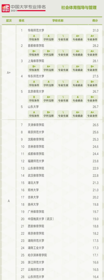 在社会体育指导与管理专业排名中,共有146所高校上榜,A+层次的高校依次为华南师范大学、首都世界杯体育官方网站、上海世界杯体育官方网站、华东师范大学、北京体育大学、山东大学。