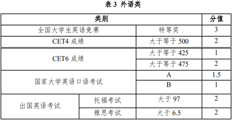 第十二条 外语类分全国大学生英语竞赛、CET 考试和出国英语考试成绩等小类,满分为 3 分,以表 3 为准;不在此列的不予考虑类推计分。本项具体计分方法:仅选择最高分值加分,每类中的每一项只能加一次分值,且最高分值不超过 3 分。