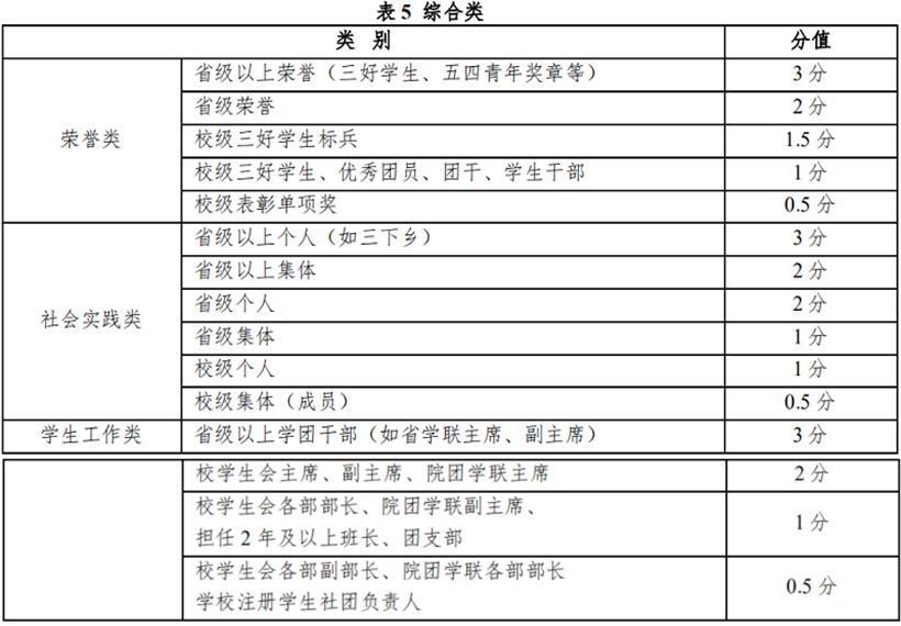 第十四条 综合类分荣誉、社会实践、学生工作 3 个小类,仅选择最高分值加分,每类中的每一项只能加一次分值,且最高分值不超过 3 分。