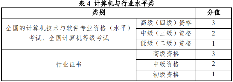 第十三条 计算机与行业水平类分全国的计算机技术与软件专业资格(水平)考试、全国计算机等级考试(计算机专业除外)和行业证书 3 个小类,满分为 3 分,以表 4 为准。