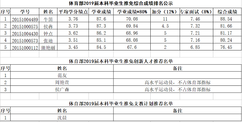 根据学校有关文件精神和《体育部推荐优秀应届本科毕业生免试攻读硕士学位研究生实施方案(2019年修订稿)》的规定,经学生自主申报,体育部推免工作小组将申请免试攻读硕士研究生同学的学业成绩进行核算,将科研、运动能力、社会实践、外语四六级成绩进行了认真审核,在此基础上,于2018年9月10日对符合条件的同学进行了专家面试,现将各位同学的成绩及排序予以公示。